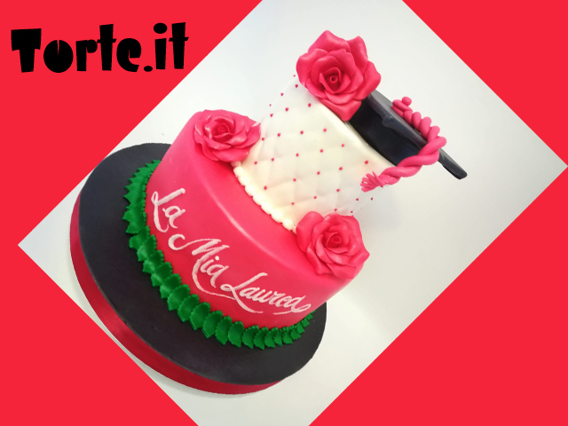 Torta di Laurea a due piani decorata con il tipico cappello dei laureandi, il tocco, ed arricchita con rose rosse in pasta di zucchero