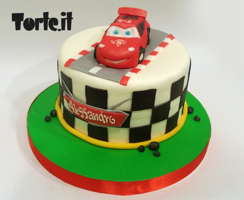 Graziosa e piccola torta decorata a tema Cars, con il simpatico Saetta realizzato in pasta di zucchero, per festeggiare in famiglia un compleanno di un ometto speciale.